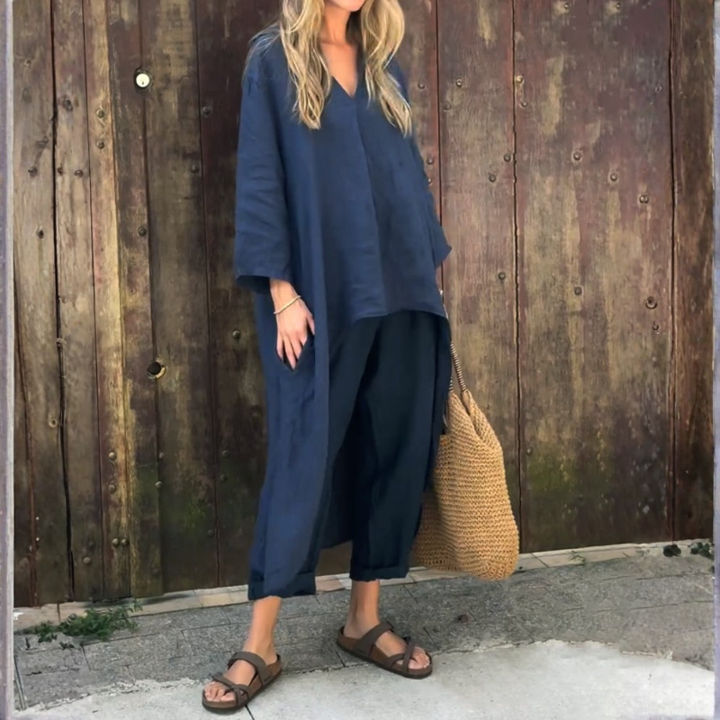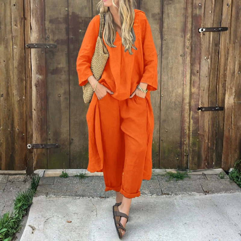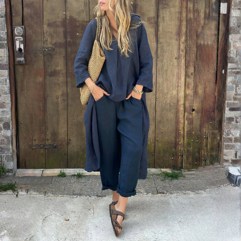 Dwuczęściowy zestaw prezentuje spójną, harmonijną strukturę o zrelaksowanej, ale określonej linii. Górna i dolna część obejmuje jednolitą kompozycję, estetyczną część całego wyglądu. Prosty krój oraz czyste wykończenie całości elegancki, nowoczesny charakter na wiele okazji.