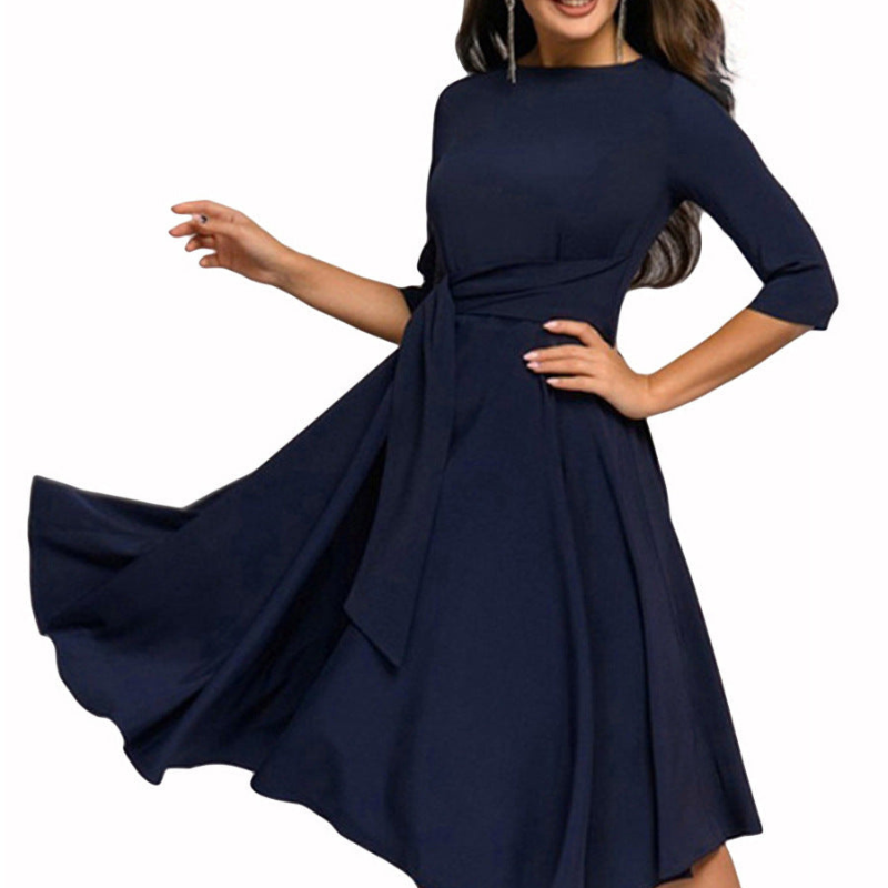 Elegancka Sukienka Midi z Paskiem i Rękawami 3/4