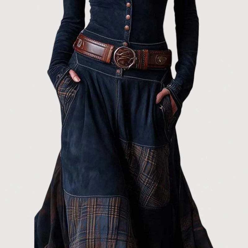 Sukienka maxi prezentuje dopasowany gorset z wyraźnie zaznaczoną talią oraz stójkowym dekoltem, który nadaje całości uporządkowany i elegancki charakter. Ozdobne guziki z przodu stanowią mocny, widoczny detal inspirowany klasycznym stylem. Dolna część sukienki układa się swobodniej, tworząc harmonijną i zbalansowaną sylwetkę.