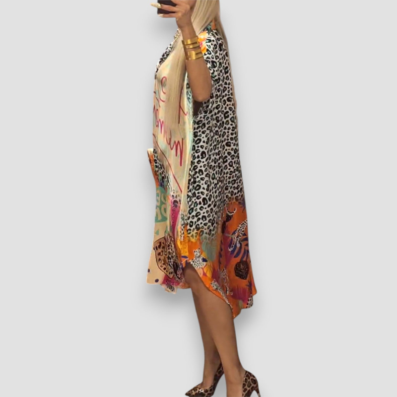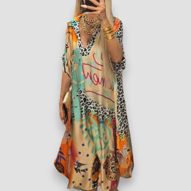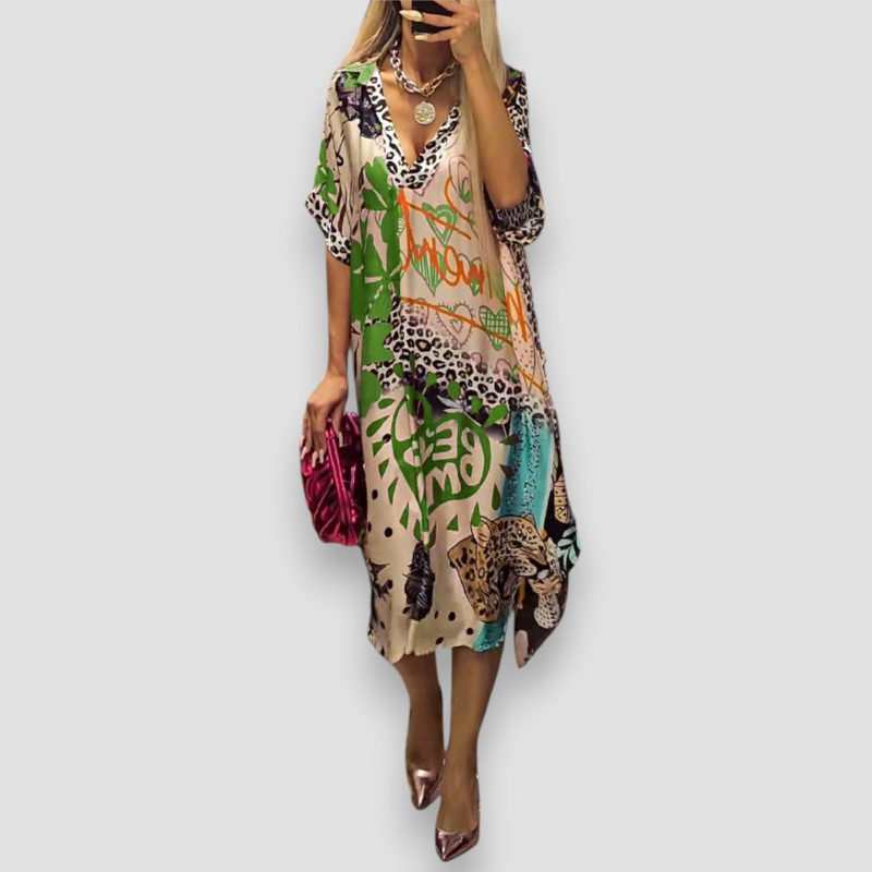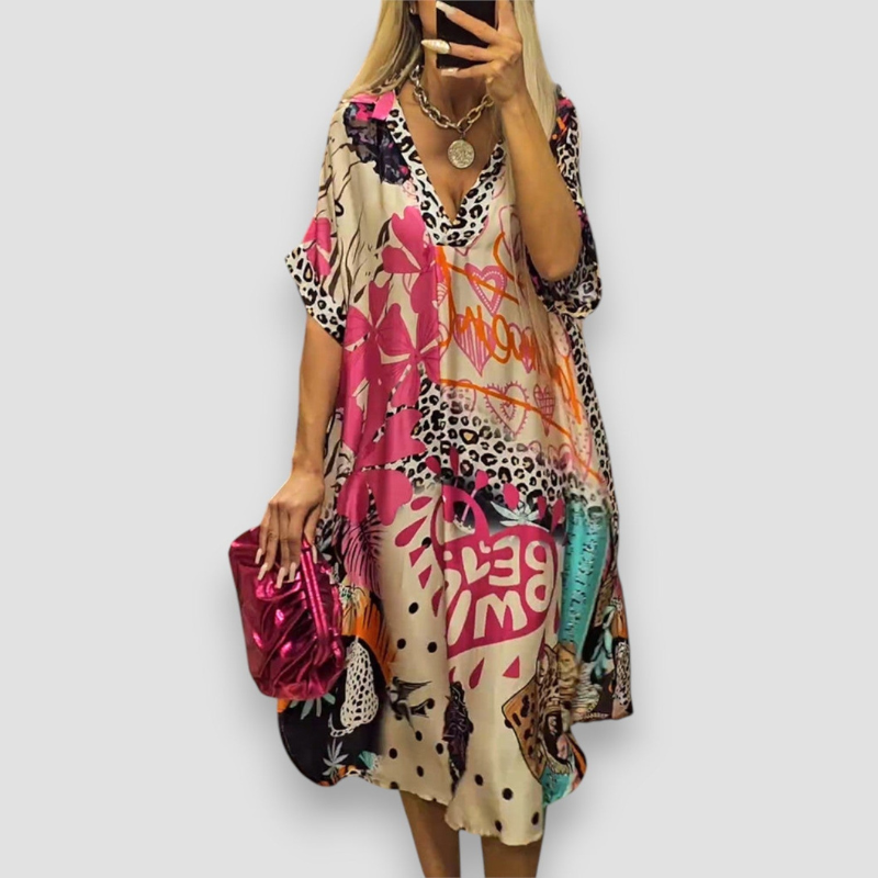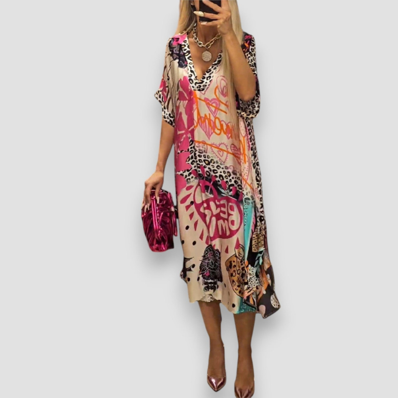 Sukienka Gianna została stworzona z myślą o słonecznych, ciepłych dniach. Dekolt w kształcie litery V oraz luźny krój tworzą harmonijną formę, która łączy wygodę z naturalną elegancją. Model zapewnia lekkość noszenia i ponadczasowy styl na każdą letnią okazję.